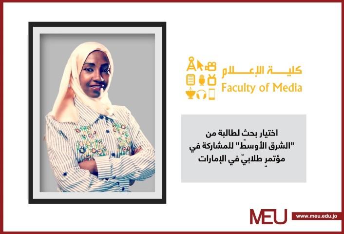 خبرني - اختير بحث طالبة كلية الإعلام في جامعة الشرق الأوسط روعة عبد الرحمن؛ للمشاركة في المؤتمر الطلابي السنويّ لعمادات شؤون الطلبة في نسخة العام، المقام في جامعة العين بالإمارات العربية المتحدة.