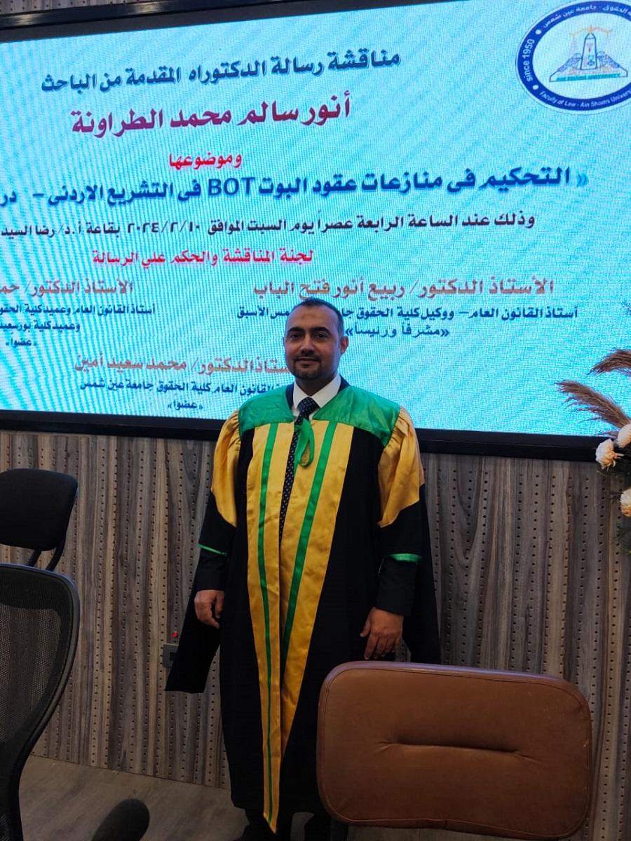 خبرني - يتقدم أبناء المرحوم سالم محمد إبراهيم الطراونة بأحر التهاني والتبريكات لأخيهم الأستاذ الدكتور انور سالم الطراونة بمناسبة حصوله على درجة الدكتوراة في تخصص القانون العام من جامعة عين شمس جمهورية مصر العربية الشقيقة بتقدير إمتياز.