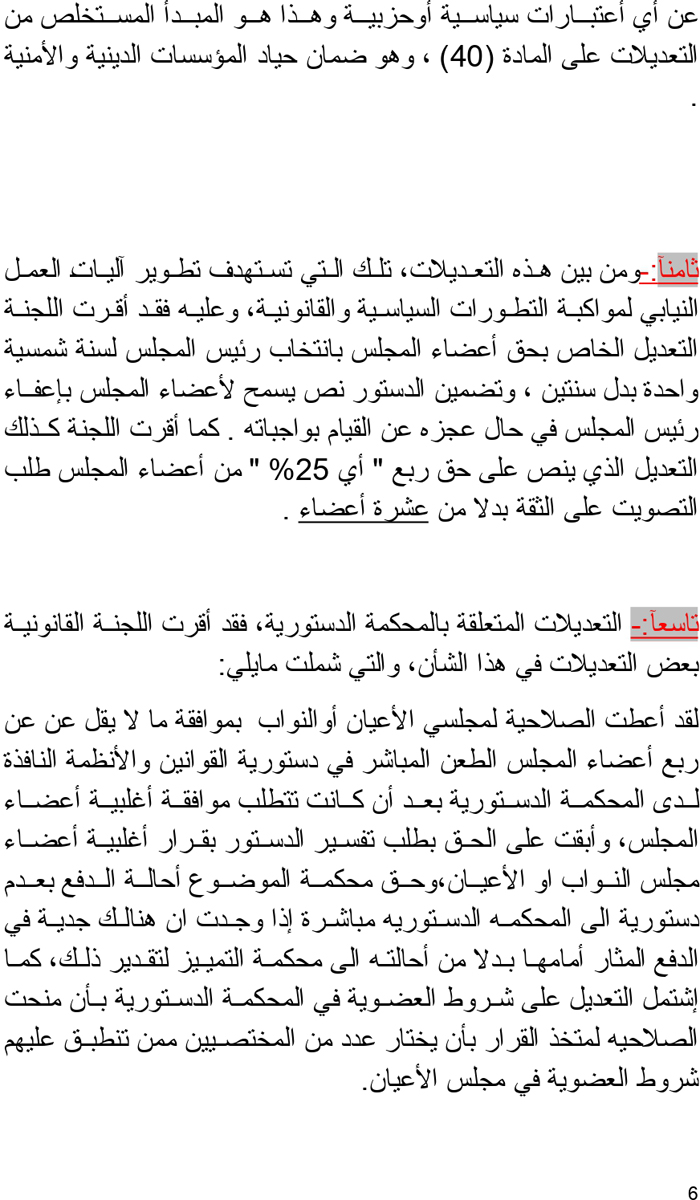 ثامنآ:-ومن بين هذه التعديلات، تلك التي تستهدف تطوير آليات العمل النيابي لمواكبة التطورات السياسية والقانونية، وعليه فقد أقرت اللجنة التعديل الخاص بحق أعضاء المجلس بانتخاب رئيس المجلس لسنة شمسية واحدة بدل سنتين ، وتضمين الدستور نص يسمح لأعضاء المجلس بإعفاء رئيس المجلس في حال عجزه عن القيام بواجباته . كما أقرت اللجنة كذلك التعديل الذي ينص على حق ربع " أي 25% " من أعضاء المجلس طلب التصويت على الثقة بدلا من عشرة أعضاء .