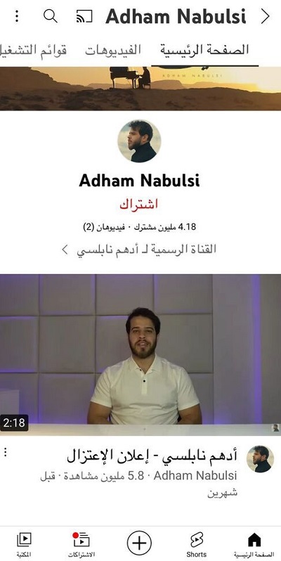 خبرني - حذف الفنان الأردني أدهم النابلسي أغانيه من قناته على "يوتيوب" ولم يترك سوى مقطعي فيديو فقط، الأول لأغنيته عن الأم، والثاني إعلانه اعتزال الغناء.