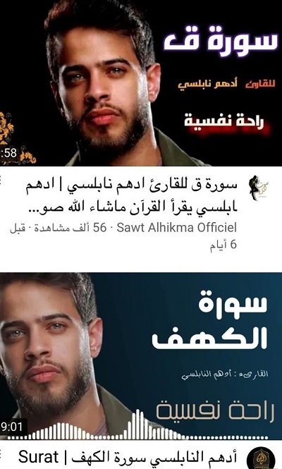 ويتداول على "يوتيوب" عدد من مقاطع الفيديو، التي سجّل بها أدهم النابلسي عددا من سور القرآن الكريم بصوته، منها سورة الكهف والشعراء ومريم والعنكبوت والزمر والبقرة.