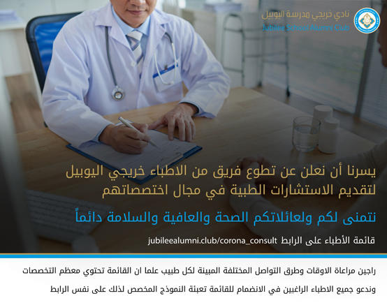 ونشر نادي خريجي اليوبيل رابط (اضغط هنا) التالي قائمة الاطباء واختصصاتهم وطرق التواصل معهم والاوقات التي يفضلون تقديم الاستشارة بها راجين مراعاة الاوقات وطرق التواصل المختلفة المبينة لكل طبيب.