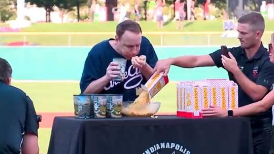 خبرني - حطم الأمريكي جوي تشيستنت الرقم القياسي في التهام الفشار، حيث تمكن من التهام 32 عبوة فشار يبلغ وزن الواحدة منها 600 غرام تقريبا، خلال 8 دقائق فقط.