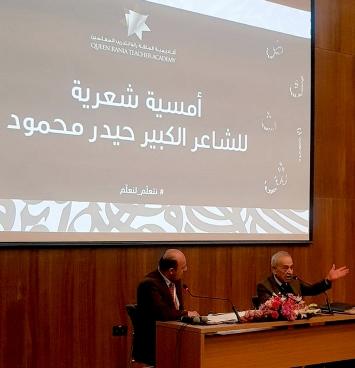 خبرني - نظمت أكاديمية الملكة رانيا لتدريب المعلمين، مساء اليوم الأحد، أمسية شعريّة للشاعر حيدر محمود، ضمن فعالياتها للاحتفاء باليوم العالميّ للغة العربيّة.