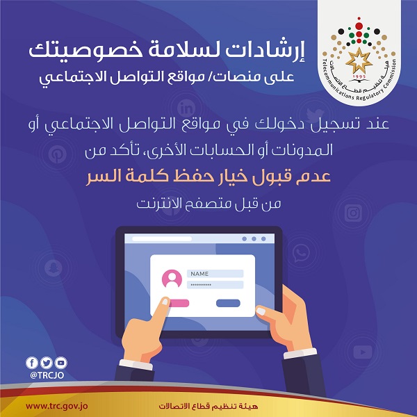 خبرني - دعت هيئة تنظيم الاتصالات المواطنين الى توخي الحذر عند تسجيل الدخول في مواقع التواصل الاجتماعي.