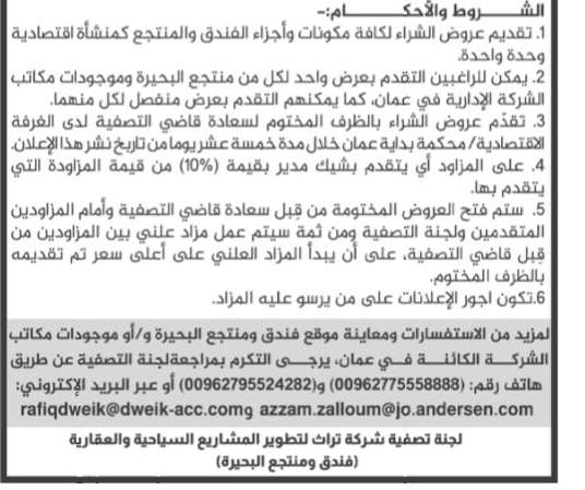 خبرني - أعلنت لجنة تصفية شركة التراث لتطوير المشاريع السياحية والعقارية في محكمة صلح عمان للمرة الثالثة، عن بيع فندق ومنتجع "البحيرة، والذي يقع على مساحة اكثر من 217 الف دونم من الأراضي الميرية.