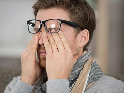 أحياناً يتعلق جسم غريب أو غبار في العين، ويحاول الأشخاص التخلص من هذا الغبار أو الأجسام الغريبة المتعلقة عن طريق فرك العينين. وهذا أمر خاطيء لأن هذه الاجسام يمكن أن تلتصق بالقرنية بسهولة.