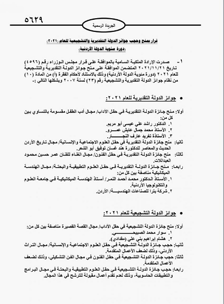 خبرني - صدرت الارادة الملكية السامية بالموافقة على قرار مجلس الوزراء المتضمن الموافقة على منح جوائز الدولة التقديرية والتشجيعية للعام 2021 (دورة مئوية الدولة الأردنية).