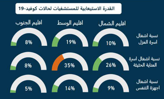 وفي إقليم الجنوب، بلغت نسبة إشغال أسرّة العزل 8 بالمئة، ونسبة إشغال أسرّة العناية الحثيثة 8 بالمئة، فيما بلغت نسبة إشغال أجهزة التنفس الاصطناعي في الإقليم ذاته 5 بالمئة.