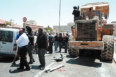 خبرني - قالت مصادر إسرائيلية إن فلسطينيا دهس بجرافة حافلة وسيارة دورية تابعة للشرطة الإسرائيلية قرب المجمعالتجاري في حي المالحة بالقدس اليوم الخميس. وتفيد التقارير الأولية بأن مدنيا ورجال الشرطة من الجانب الإسرائيلي قاموا بإطلاق النار على الفلسطيني وأردوه شهيدا . كما أصيب شرطيان اسرائيليان  بجروح طفيفة بعد أن تمكن سائق الجرار من قلب سيارة الشرطة , وكانت مدينة القدس شهدت ثلاثة حوادث مماثلة أدت لمقتل وإصابة عدد من الإسرائيليين إلى جانب استشهاد منفذيها رصد أخباري