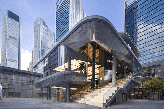 يعتمد متجر هواوي الرئيسي العالمي، وهو عبارة عن مبنى مستقل من ثلاثة طوابق، على المفهوم التصميمي "ساحة المدينة City Square"، الذي يجمع بين الفلسفة المعمارية الصينية والغربية التقليدية. تتكون الواجهة من مساحة واسعة من الزجاج الشفاف ذي النفاذية العالية بزوايا مستديرة، بما يشبه المينا الزجاجية الرائعة.
