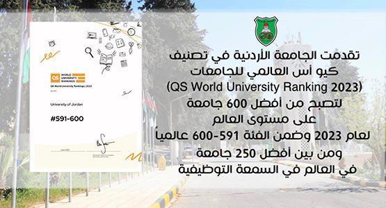 خبرني - تقدمت الجامعة الأردنية في تصنيف كيو أس العالمي للجامعات (QS World University Ranking 2023) لتصبح من أفضل 600 جامعة على مستوى العالم لعام 2023 وضمن الفئة 591-600 عالمياً، في التصنيف الذي أعلن اليوم من قبل المؤسسة البريطانية (QS Quacquarelli Symonds) بعد أن كانت في فئة أفضل601-650 للسنوات الأربع الماضية، كما احتلت المرتبةالاولى محلياً، الأمر الذي يؤكد الدور الريادي ومسيرة التميز الممتدة تاريخيا للجامعة الأم.