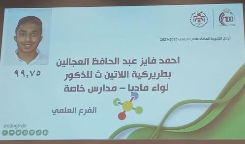 وحصل العاجلين على ترتيب الأول على المملكة في التوجيهي بمعدل 99.75 عن الفرع العلمي.