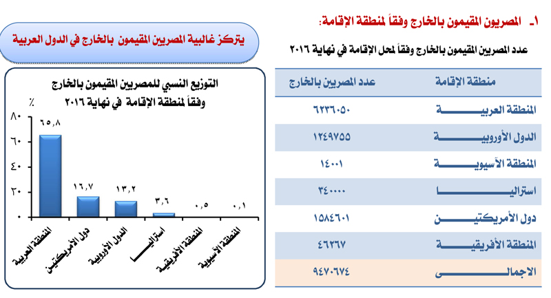 ويشير توزيع المصريين في الخارج الصادر عن الجهاز المركزي للتعبئة العامة والاحصاء الى تواجد 9.5 مليون مصري مغترب خارج مصر، وان 65.8 % من المصريين مغتربين في الدول العربية ، و16.7 % في الأميركتين ، و13.2 % في أوروبا ، و3.6 %في استراليا.