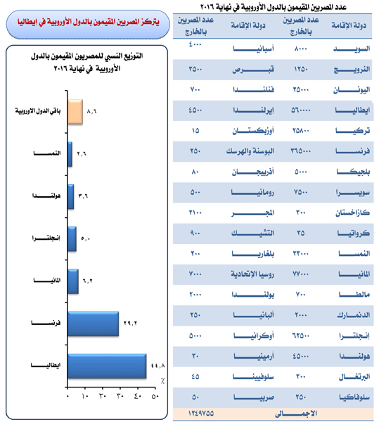 اما في أوروبا فيتواجد اغلب المصريين في إيطاليا ثم فرنسا.