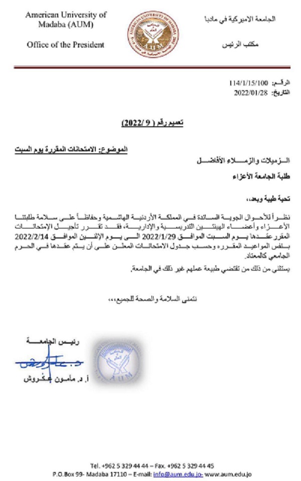 خبرني - أصدر رئيس الجامعة الأمريكية في مادبا أ.د. مأمون عكروش , تعميم بخصوص تاجيل امتحانات يوم السبت الموافق 29/1/2022 .