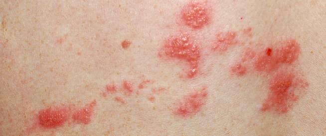بثور يملؤها سائل قابلة للانفجار، وقد تتكون عليها قشور.