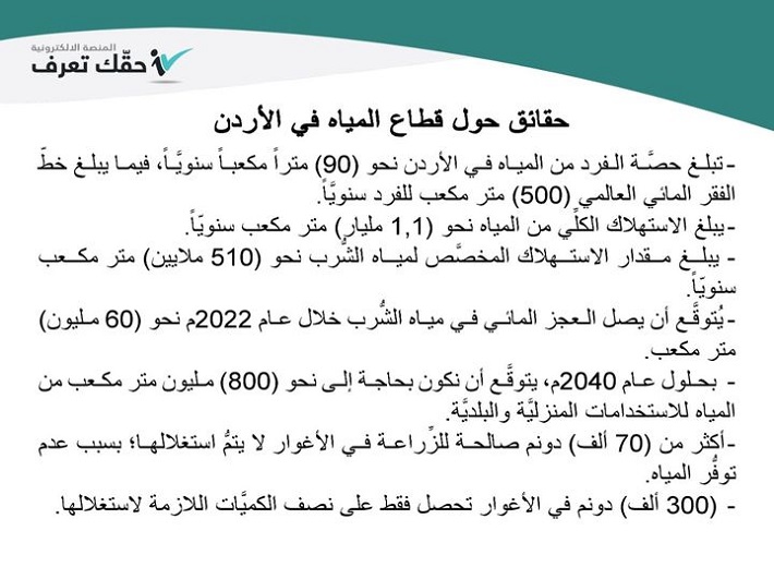خبرني - نشرت الحكومة مساء اليوم الأربعاء ما وسمته بـ (حقائق حول قطاع المياه في الأردن) بالإضافة إلى مشروع الناقل الوطني.