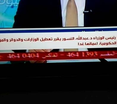 خبرني- قرر رئيس الوزراء الدكتور عبد الله النسور تعطيل الوزارات والدوائر والمؤسسات الحكومية اعمالها يوم غد الخميس، نظرا للظروف الجوية السائدة، وذلك وفق ما نقله التلفزيون الأردني. وكانت دائرة الارصاد الجوية ومديرية الدفاع المدني ومديرية الامن العام قد حذرت من نتائج العاصفة الجوية وعدم الخروج الا للضرورة القصوى، حتى لا تتم إعاقة حركة السير. كما قرر محافظ البنك المركزي الدكتور زياد فريز تعطيل أعمال البنك المركزي والبنوك العاملة في المملكة الخميس، وذلك نظرا للظروف الجوية السائدة في المملكة.