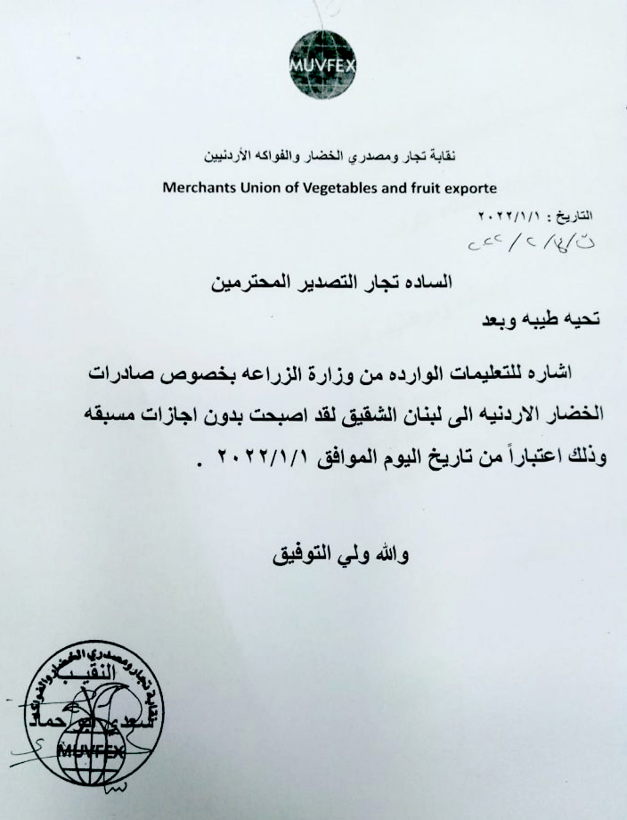 خبرني - أقرت وزارة الزراعة التصدير إلى لبنان بدون إجازات مسبقة، حيث يسري القرار التالي بداية العام الحالي.