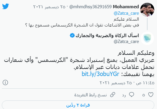 وقال حساب "اسأل الزكاة والضريبة والجمارك" في موقع "تويتر" ردا على أحد المغردين: إنه "يمنع إستيراد شجرة الكريسماس وأي شعارات تحمل علامات ديانات غير الإسلام".