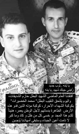 خبرني - جمعت صورة جرى تداولها اليوم الخميس الشهيدين النقيب محمد ياسين الخصيرات والملازم /١ حازم واصف الشديفات.
