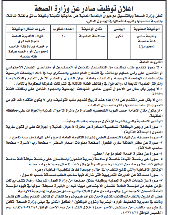 خبرني - أعلنت وزارة الصحة وبالتنسيق مع ديوان الخدمة المدنية عن حاجتها لتعبئة وظيفة سائق من الفئة الثالثة. الشروط التالية: