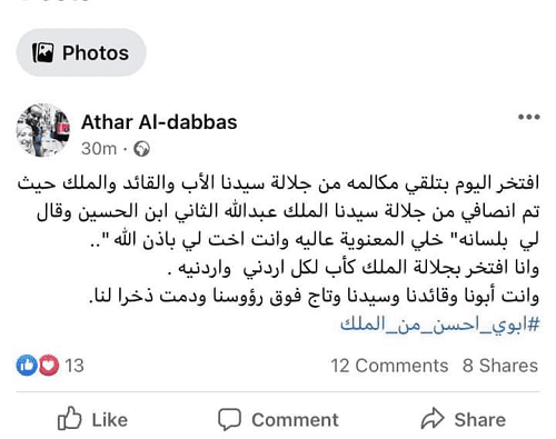 والتقط جلالة الملك عبد الله الثاني الرسالة فور ان تناهى الى مسامعه الخبر، فبادر جلالته الى مهاتفة الفتاة آثار وأبلغها – وفق ما نشرت الفتاة على فيس بوك :" خلي المعنوية عالية .. أنت أخت لي بإذن الله".