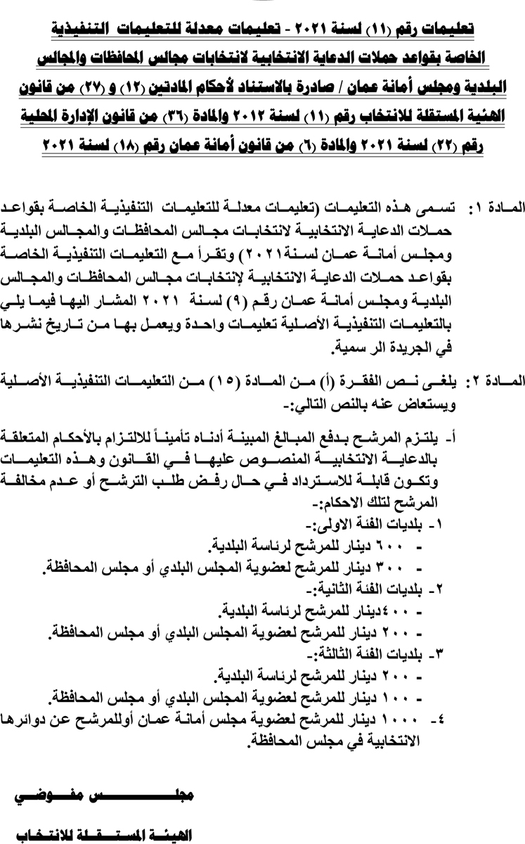 خبرني - نشرت الحكومة في الجريدة الرسمية تعليمات معدلة للتعليمات التنفيذية الخاصة بقواعد حملات الدعاية الانتخابية لإنتخابات مجالس المحافظات والمجالس البلدية ومجلس أمانة عمان.