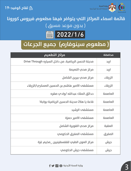 خبرني – أعلنت وزارة الصحة ، الاربعاء، عن قائمة أسماء المراكز التي يتوافر فيها مطعوم فيروس كورونا (بدون موعد مسبق) وبجميع الجرعات ليوم الخميس.