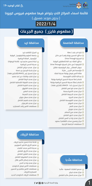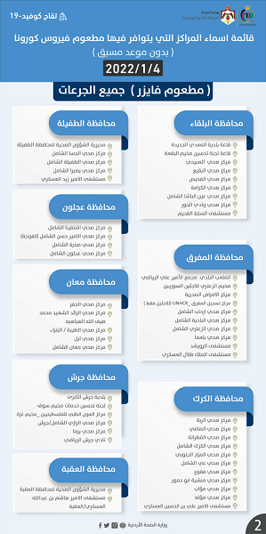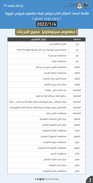 خبرني – أعلنت وزارة الصحة عن قائمة أسماء المراكز التي يتوافر فيها مطعوم فيروس كورونا (بدون موعد مسبق) لجميع الجرعات ليوم الثلاثاء.