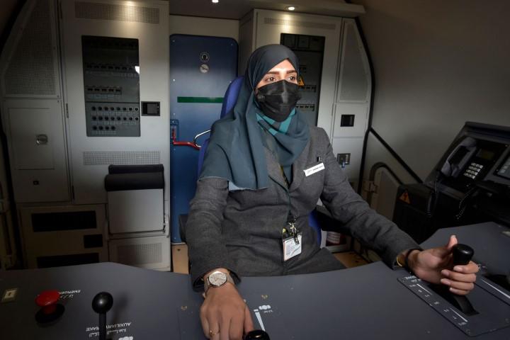 تجلس السعودية ثراء علي في مقعد القيادة في قطار فائق السرعة ينقل الحجاج إلى مكة، مستفيدة من سعي المملكة، في إطار جهودها لتعزيز نموها الاقتصادي، إلى توفير الوظائف لعدد متزايد من السعوديات اللواتي يُقبلن على سوق العمل.