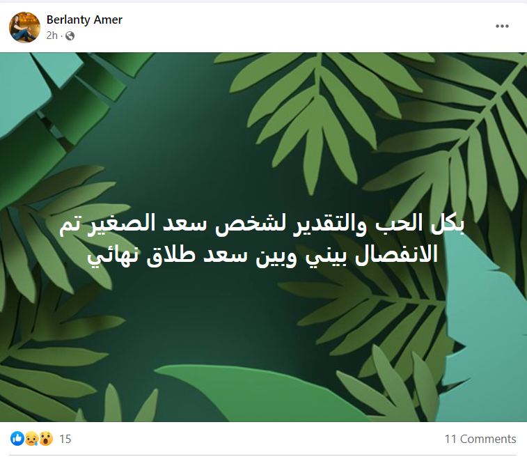 خبرني - أعلنت الفنانة المصرية، برلنتي عامر، الزوجة الثانية للفنان المصري، سعد الصغير، انفصالها بشكل رسمي عنه، بعد قصة حب جمعتهما وزواجهما استمرت لمدة عام.