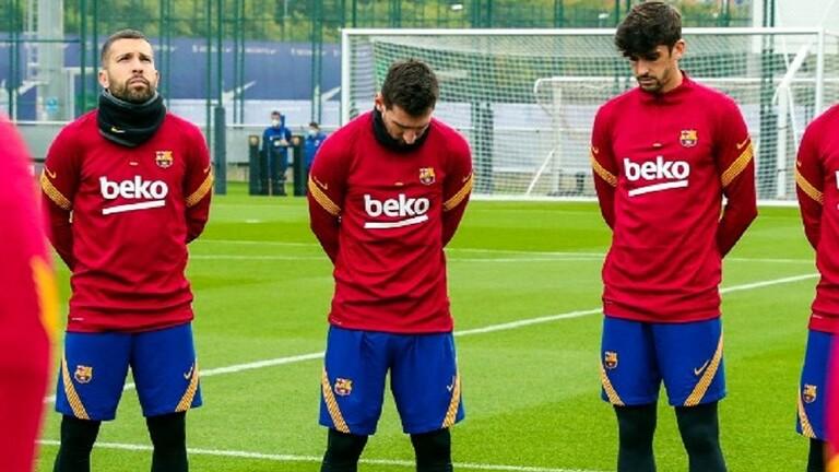 ونشر الحساب الرسمي لنادي برشلونة فيديو وصورا تظهر لاعبي وإداريي النادي الكتالوني يقفون دقيقة صمت على روح مارادونا قبل بداية تمارين اليوم الجمعة.