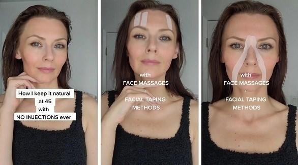 وفي مقطع ثانٍ من الفيديو الخاص بها، قامت بوضع الشريط اللاصق من أعلى أنفها، عبر خدها وصولاً إلى ذقنها على كلا الجانبين. وتعرض أيضاً على تيك توك مقاطع تشرح فيها عملية تدليك الوجه.