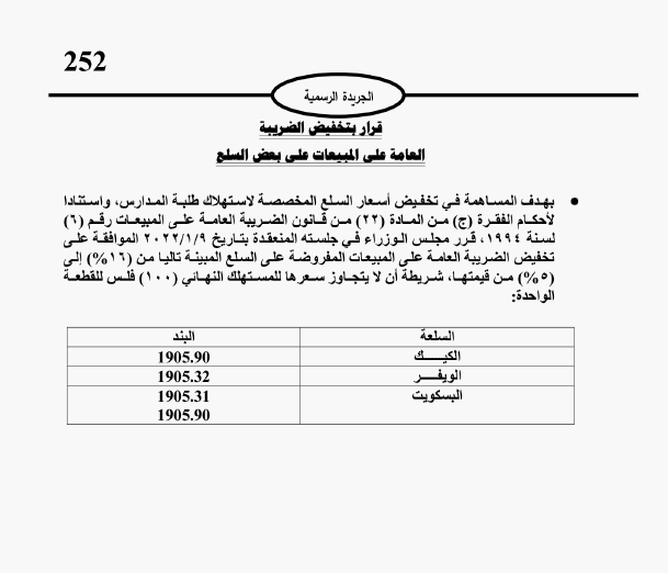 وأشار مجلس الوزراء، في عدد الجريدة الرسمية، الأربعاء، أن القرار جاء بهدف المساهمة في تخفيض أسعار السلع المخصصة لاستهلاك طلبة المدارس.
