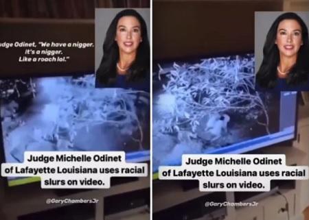 خبرني - تداول رواد مواقع تواصل أمريكية فيديو مسرب من منزل القاضية ميشيل أودينيت قاضية محكمة مدينة لافاييت بولاية لويزيانا الأمريكية ، حيث كشف تلفّظها بإهانات عنصرية بشكل متكرر أمام ضيوفها.