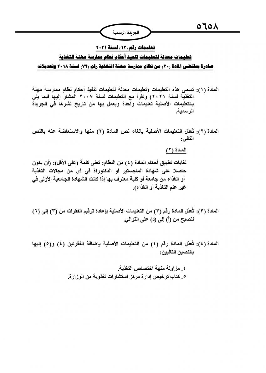 خبرني - صدر في عدد الجريدة الرسمية تعليمات معدلة لتعليمات تنفيذ أحكام نظام ممارسة مهنة التغذية.