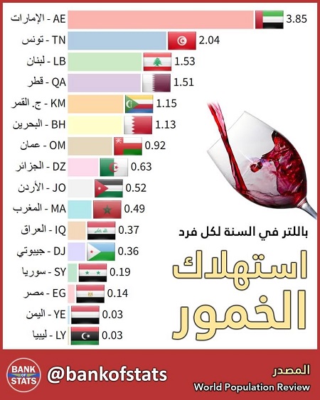 خبرني - حل الأردن في المرتبة التاسعة عربيا، معدل الاستهلاك المتوسط للكحول لكل فرد في السنة، وفق موقع بانك اوف ستاتس.