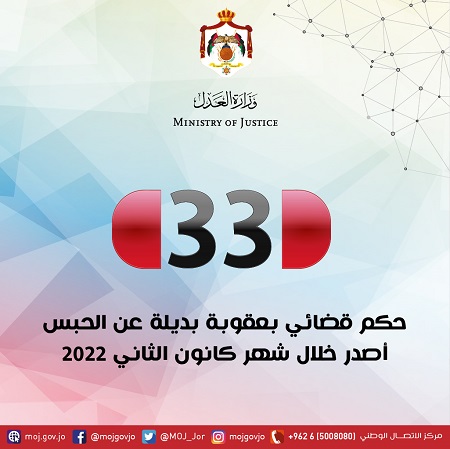 خبرني - قالت وزارة العدل إنه تم تنفيذ 33 عقوبة بديلة عن عقوبة الحبس خلال الشهر الماضي (كانون الثاني 2022).