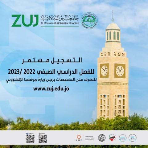 خبرني - تعلن دائرة القبول والتسجيل في جامعة الزيتونة الاردنية الاستمرار في تسجيل المواد للفصل الــدراسي الصيفي للعام الجامعي (2022/2023) لدرجة البكالوريوس والماجستير في البرامج الاكاديمية التالية: