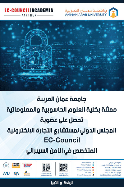 خبرني - ضمن خطتها لمواكبة التطورات الأكاديمية والمهنية العالمية في مجال علوم الحاسوب والأمن السيبراني Cybersecurity حصلت جامعة عمان العربية ممثلة بكلية العلوم الحاسوبية والمعلوماتية على عضوية المجلس الدولي لمستشاري التجارة الإلكترونيةEC-Council المتخصصة في الأمن السيبراني وذلك بهدف رفع مستوى طلبة الكلية أكاديمياً ومهنياً وتأهيلهم للمنافسة في سوق العمل من خلال مشاركتهم بالدورات والورش التدريبية المتخصصة وحصولهم على الشهادات المهنية العالمية في مجال الأمن السيبراني.