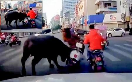 ويُظهر الفيديو امرأة تنتظر على دراجتها النارية عند إشارة مرور في مفترق طرق.. وفجأة ظهرت جاموسة ونطحت المرأة بقوة وعنف، حتى أسقطتها من دراجتها على الأرض، وطارت خوذة الحماية من على رأسها، وقد حدث كل ذلك أمام سائقي السيارات وضباط المرور المصدومين.