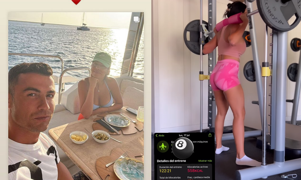 ونشرت جورجينا صورة لها عبر خاصية "ستوري" على موقع "إنستغرام" وهي جالسة في عشاء رومانسي مع كريستيانو رونالدو على يخت في وسط البحر، ومقطع فيديو مثيرا وهي تمارس التمارين الرياضية داخل الصالة، وتقفز وهي حاملة أوزانا على كتفيها.