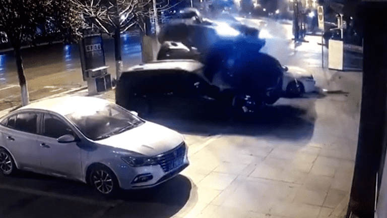 وأظهرت لقطات كاميرا مراقبة سائق السيارة وهو يسير على طول طريق مزدوج، قبل أن يفقد السيطرة على المنعطف ويصطدم بالرصيف، ومن ثم تطير السيارة فوق الطريق وتتدحرج على سطوح 3 مركبات متوقفة بجانب بعضها البعض، قبل أن تهبط في الفجوة بينها وبين سيارة رابعة.
