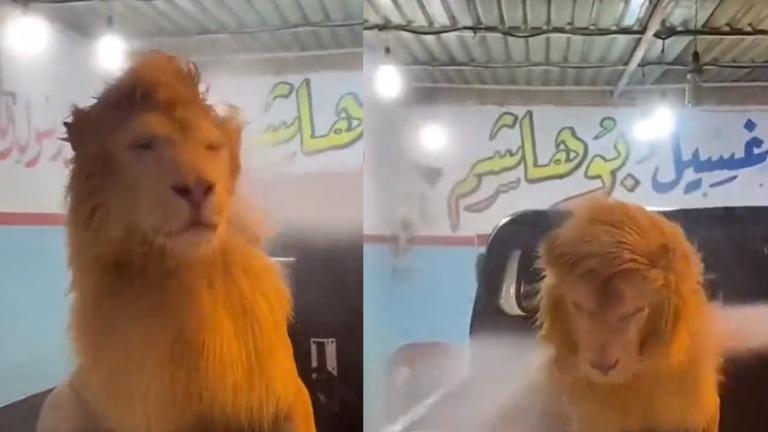 وتداول رواد مواقع التواصل الاجتماعي والصفحات الإخبارية مقطع الفيديو، حيث ظهر الأسد داخل صندوق خلفي لمركبة، فيما يرش عليه الشاب المياه بواسطة خرطوم.
