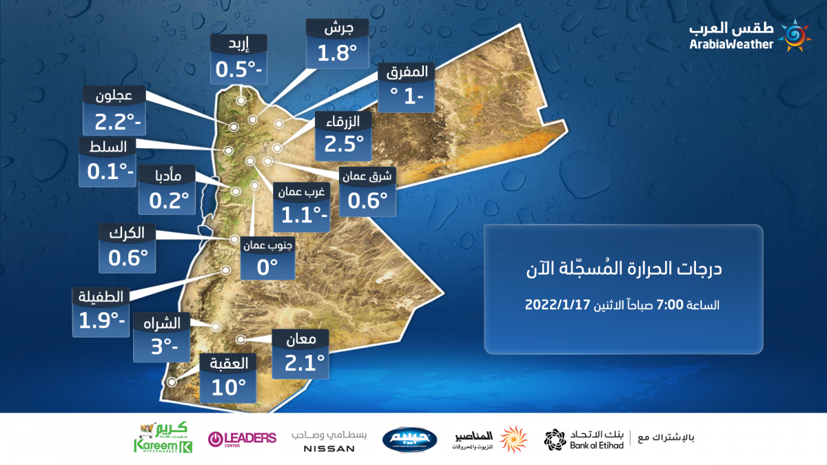 الخريطة المرفقة تبين درجات الحرارة المسجلة الساعة السابعة صباحا و التي تبين تدني درجات الحرارة الى ما دون الصفر المئوي بما في ذلك اجزاء من العاصمة عمان.