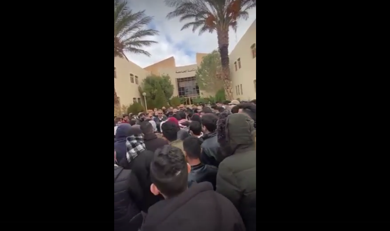 وبحسب مقطع الفيديو، تجمهر عشرات الطلبة من زملاء أبو الشوك، بالإضافة إلى عدد من الأساتذة أمام مبنى الرئاسة، ودعوا له بشكل جماعي.