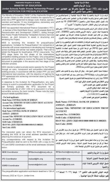 خبرني - أعلنت وزارة التربية والتعليم، عن رغبتها في دعوة المستثمرين من القطاع الخاص للدخول في فرصة اتفاقية شراكة بين القطاعين العام والخاص "تصميم، بناء، تمويل، تشغيل وصيان المباني، والتحويل"، 15 بناء مدرسي جديد للمراحل "رياض الأطفال، الأساسية، الثانوية.