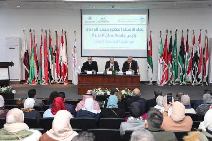 خبرني - التقى الأستاذ الدكتور محمد الوديان رئيس جامعة عمان العربية بطلبة الجامعة (الدراسات العليا، والبكالوريوس) وذلك ضمن سلسلة اللقاءات الدورية التي تنظمها عمادة شؤون الطلبة وتهتم بها الجامعة مع الطلبة الذين هم اللبنة الأساسية بالعملية التعليمية التعلمية بالجامعة، وهو ما تدعو اليه على الدوام قيادتنا الهاشمية بدور الشباب في بناء المجتمع.